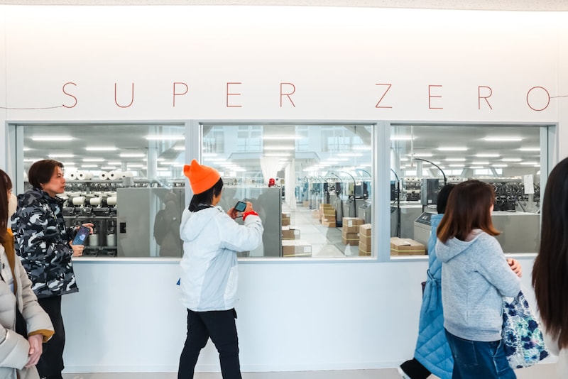 2023年4月に稼働開始したフタバスーパーゼロミルでは、復興・学び・産業観光を目的とした見学ルートを設けています。一行は、同社の歩みや、一般的な綿糸と水溶性の糸を組み合わせた世界初の特許技術撚糸、SUPER ZERO®の生産工場、事務所の様子などを見学しました。