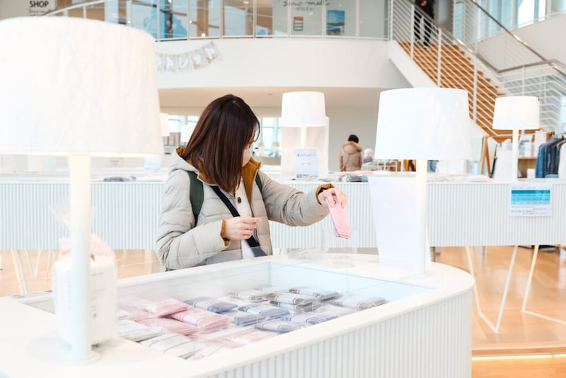 見学後は直営のタオルショップでお買い物。SUPER ZERO®を織り込んだ吸水性と即乾性に優れた高機能タオル「エアーかおる」をはじめとした商品が並び、手ざわりを感じながら買い物を楽しみました。