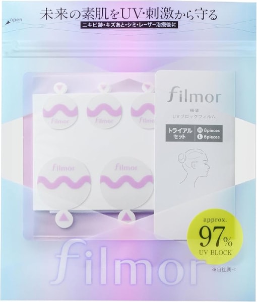 FILMORの「約97%UVブロックフィルム」は、シミだけでなくホクロの除去やニキビ・傷跡を保護する必需品。不安定な状態が続くレーザー施術後の約2か月間、わずかなUVはもちろんうっかり触ってしまうなどの外部刺激から肌を守ります。