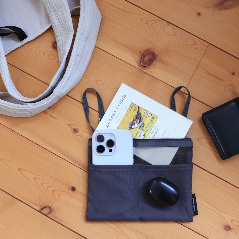 ポケットや仕切りのないバッグの使い勝手が良くなる、持ち手に吊り下げるバッグインバッグ。後からポケットを付け足すような感覚で、イヤホンなど小物の定位置をつくれます。