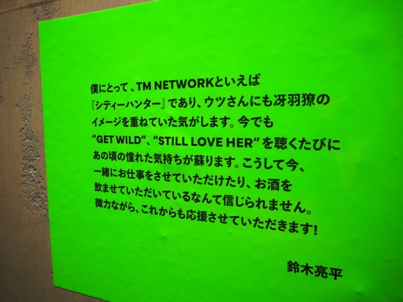 知の哲学ではTM NETWORK3人のほか、実写版シティーハンターで主役を務めた鈴木亮平さんやヒャダインさんなど、彼らと縁の深い方々からの言葉(哲学)も展示されてます。