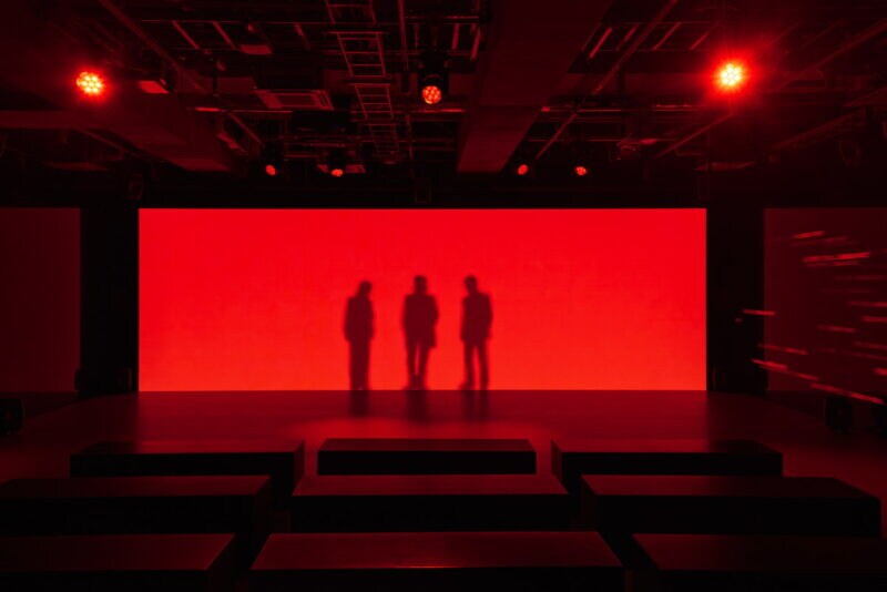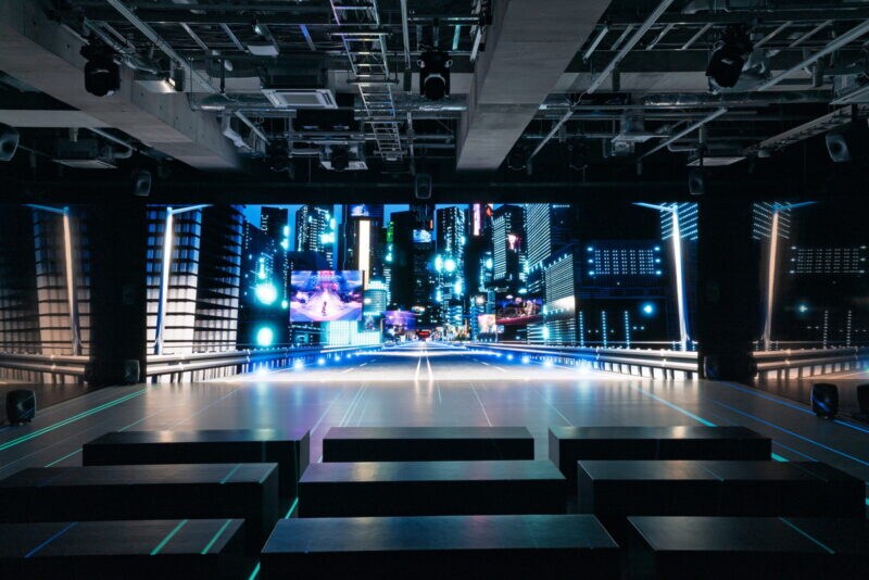 「知の公園」は、シアター風のエリア。前方と左右の3面のスクリーンには、音に合わせて目まぐるしく動く光、スピード感溢れる映像が流れ、TM NETWORKの楽曲が楽しめる空間になっています。