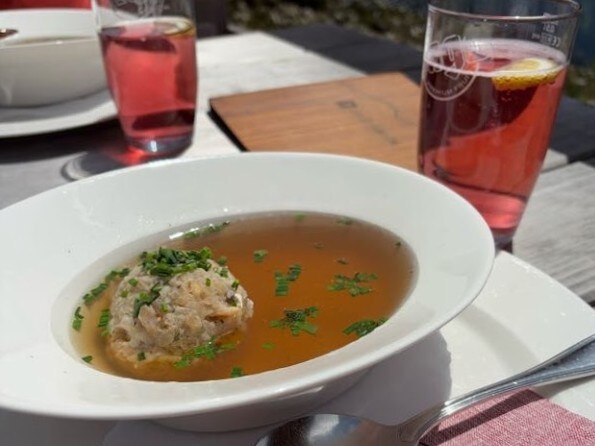 さらに岩山を登ると、山頂の山小屋のレストランに到着。がんばって歩いたあとのランチはご褒美以外の何物でもありません。松の実のソーダとスープは絶品でした!