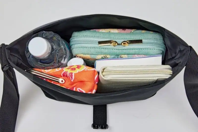 500mLペットボトル、長財布などがすっぽり収まります。コンパクトなのにしっかり入るのがうれしい!