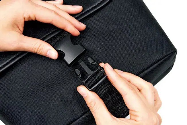 フロントの留め具はワンタッチ! 長さ調節もできますよ。