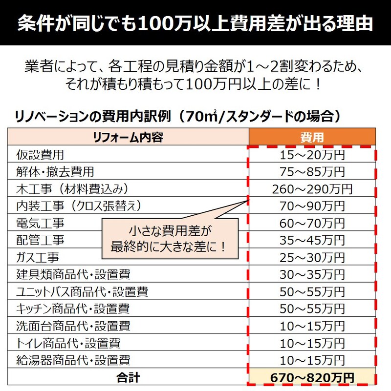 リノベーションは、解体、配管、木工事、内装仕上げといった数多くの工程が積み重なってできています。各工程で発生する1〜2割程度のわずかな費用差が、一軒分すべて合算されることで、最終的に数百万円という大きな差となって現れるのです。