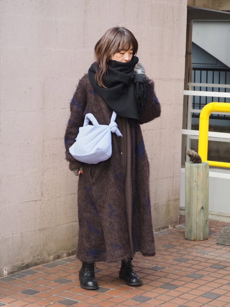 素材は、洋服を選ぶときの大事な要素。「特に冬場は、なるべく肌触りのいいものを手に取るようにしています」。そんな岩本さんが5年ほど着用しているのは「コウダグシケン」のモヘアコート。ひとクセ効いた編み地にオーバーシルエット、一枚羽織るだけでスタイリングが決まる主役級アイテムです。