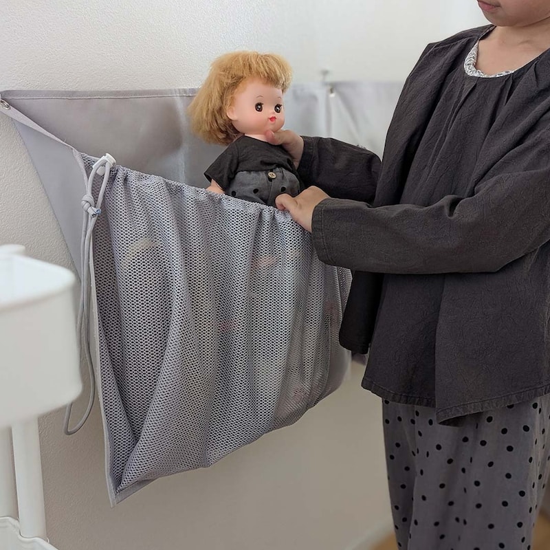 しっかり深さがあり収納力も高いので、大きめのぬいぐるみも収納OK。ポケットはメッシュ素材で、中が程よく透けて見えるので、小さなぬいぐるみをすっぽり入れても迷子になりません。