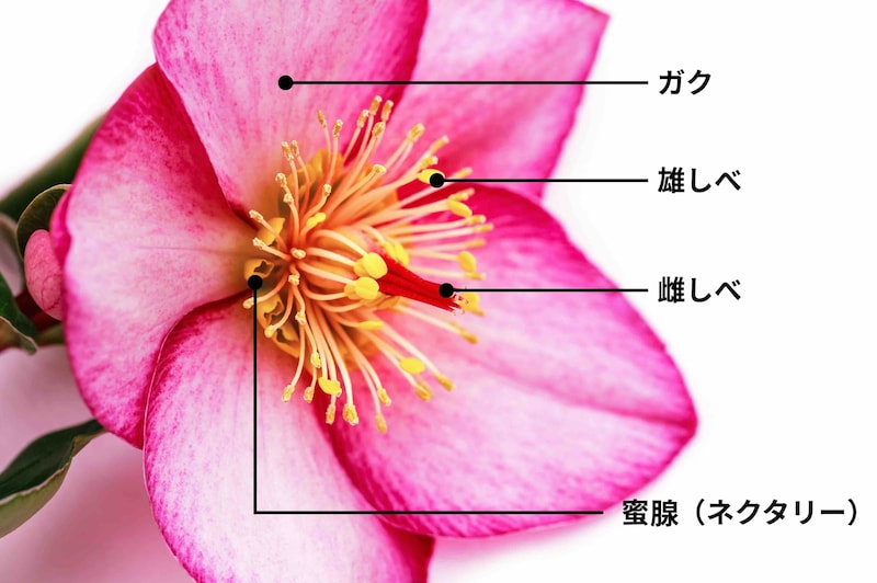 クリスマスローズの花びらに見える部分は、本当は「ガク片」。本物の花びらは、中央の蜜腺(ネクタリー)。色や模様の主役は、花びらではなく“ガク” だからこそ、花もちが抜群にいいのです。