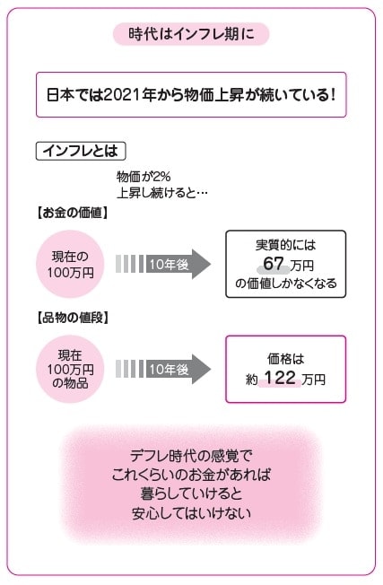 日本銀行が掲げるインフレ率は2%。たとえば、いま100万円のモノでも、毎年2%ずつ上昇すると10年後には122万円の価格になります。細かいことはわからなくても「いままでとは違って、生活しづらい時代がきているんだな」と考えておいてください。