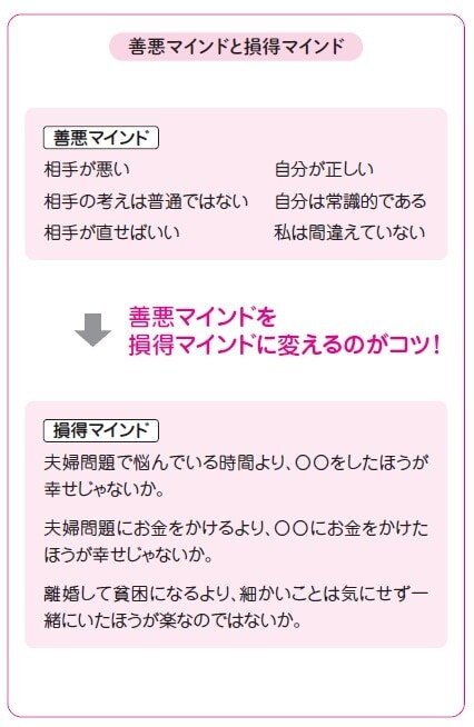 だから「善悪マインド」を「損得マインド」に変えてもらいたいのです。時間もお金も体力も有限です。離婚したほうが得か? 損か? そのくらいの考え方で将来を考えてみると、問題が解決することもあります。