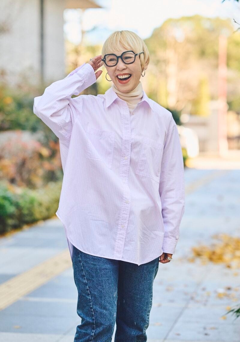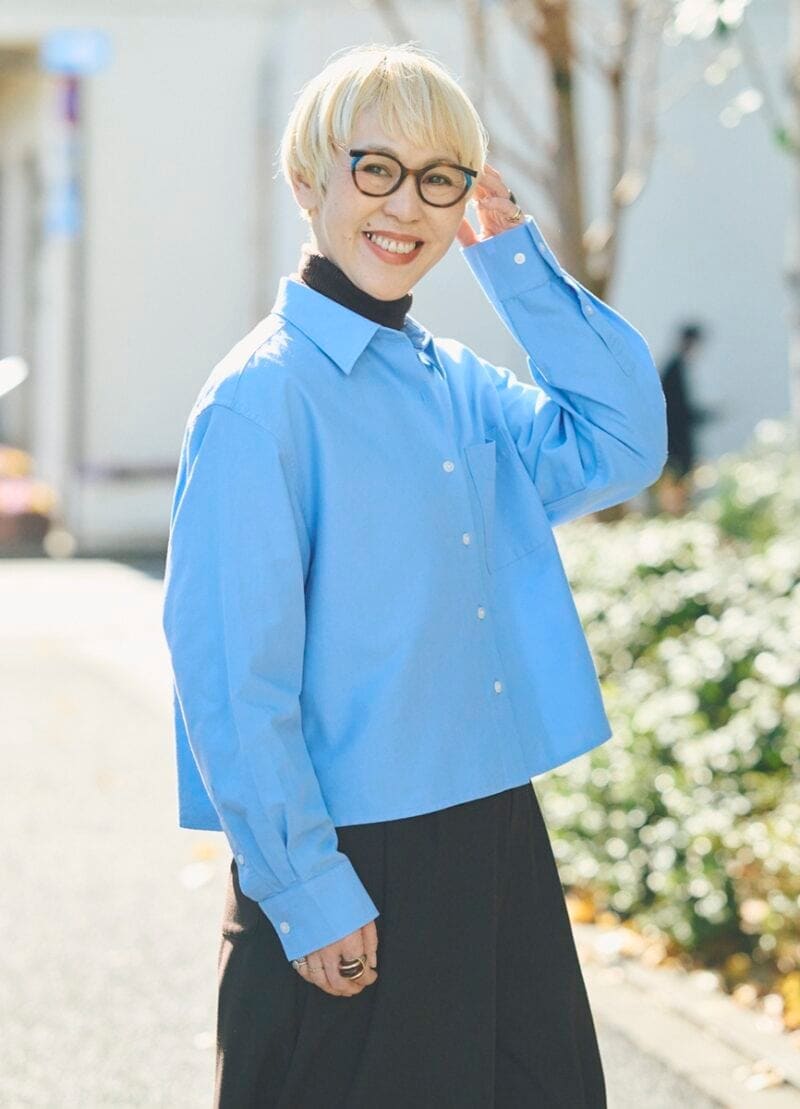 「挿し色にシャツを使いたいけれど、裾を出すか入れるか悩んでしまう、という人も。そんな人におすすめのショート丈が今は豊富にありますよ。短すぎ?と思うものでも、着てみるとちょうどおなかが隠れる場合が多いので、インにしなくてもすっきり着こなせるんです」