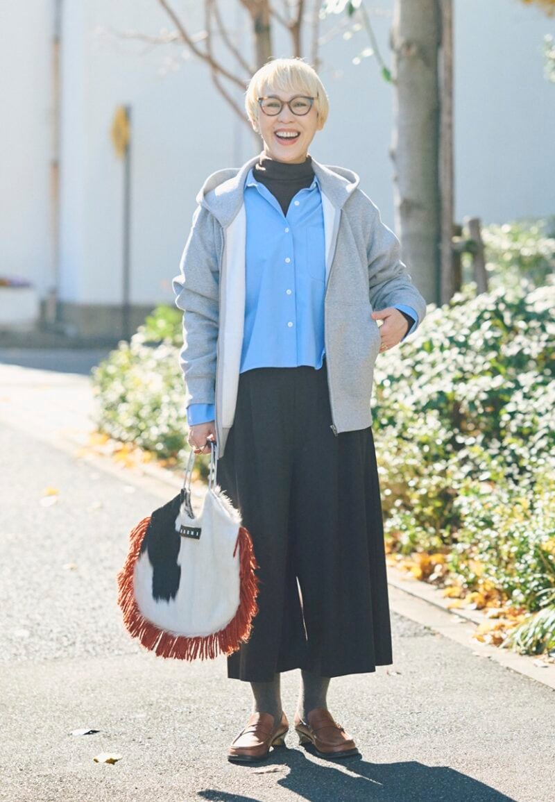 シャツ、タートルネックトップス、キュロットパンツ/すべてユニクロ、フーディ/GU、シューズ/ロエベ、バッグ/マルニ