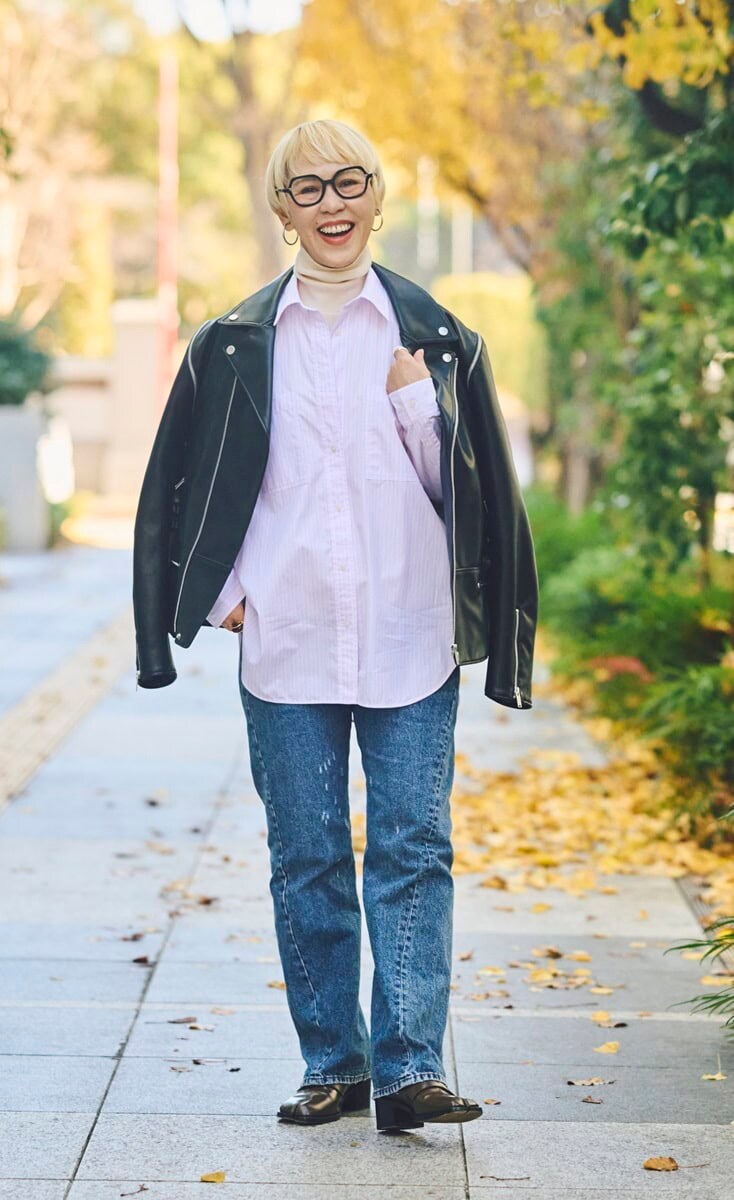 シャツ、インに着たタートルネック/ともにユニクロ、革ジャン、デニム/ともにGU、シューズ/メゾン マルジェラ