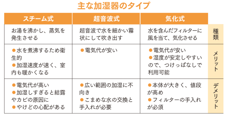 加湿器は、湿度が安定し広い部屋向きの気化式、室温を下げないスチーム式、デスクやベッドまわりなど狭い範囲向きの超音波式などがあるので、場所に合わせて上手に選んで。