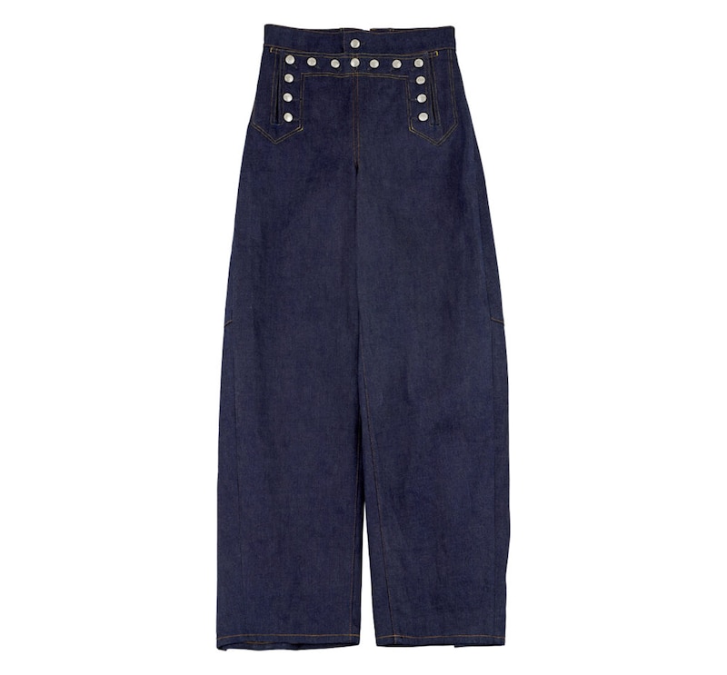’40年代のアメリカ海軍のウールセーラーパンツを象徴する、13個の開閉式のフロントボタンをあしらった〈ハイク〉のデニムパンツ。あえて旧式の織機を使用することで、凹凸のあるヴィンテージデニムの表情を再現している。緩やかに丸みを帯びた形で、はき心地はゆったり。バックはレースアップ仕様となっており、腰まわりをすらりと美しく見せてくれる。