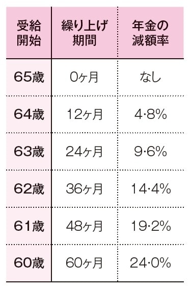 60歳から64歳11ヶ月までの間にもらい始めることを「繰り上げ受給」といいます。繰り上げ受給をすると、1ヶ月当たり0.4%(※)、1年で4.8%、年金が減額されます。60歳まで5年間繰り上げると、24%減額されます。これが一生続きます。