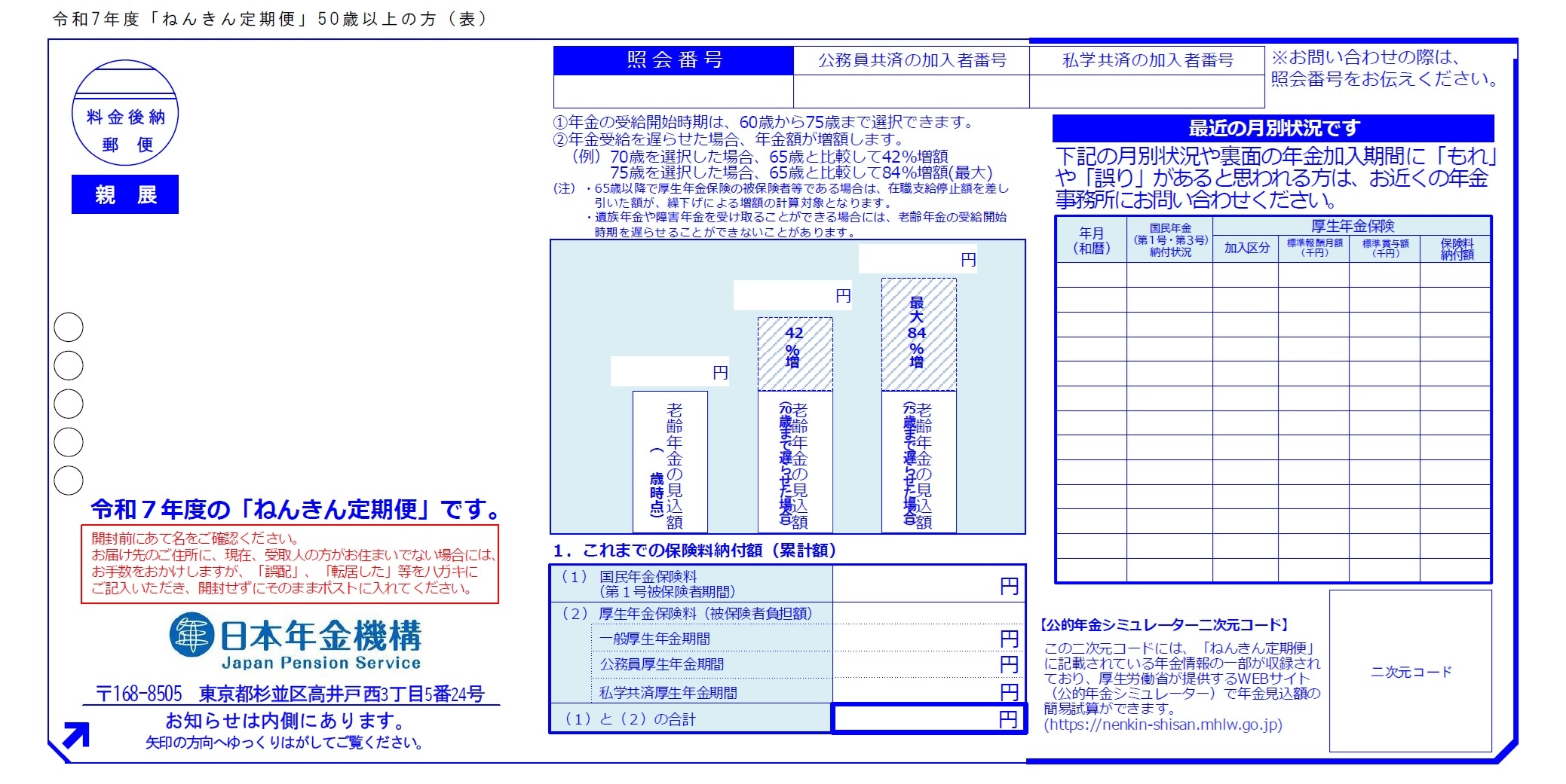 「ねんきん定期便」は、50歳未満と50歳以上では記載内容が異なります。