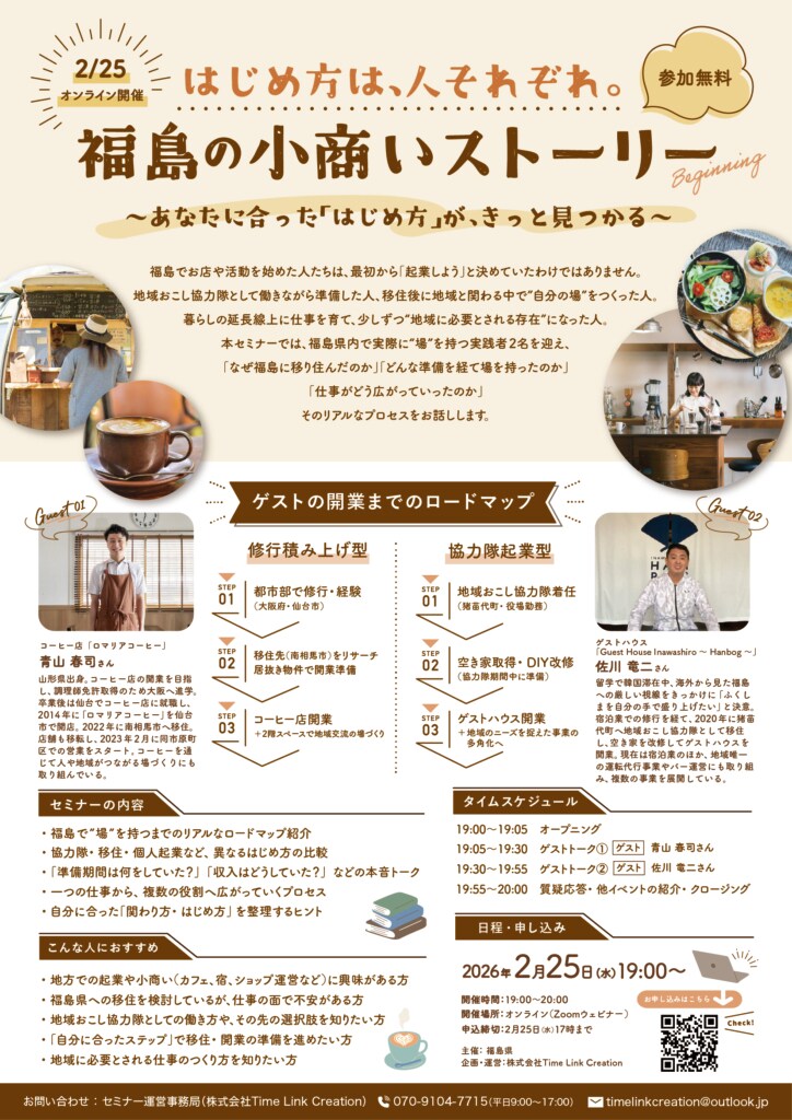 The post 【2/25(水)19時〜オンライン開催】「はじめ方は、人それぞれ。福島の小商いストーリー 〜あなたに合った「はじめ方」が、きっと見つかる〜」セミナー参加者募集! first appeared on Nativ.media | 地方移住・関係人口創出のプラットフォーム.