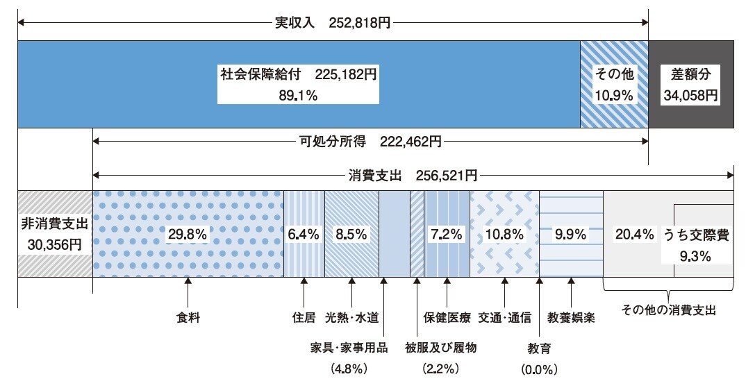 その一方で、年金などの社会保障給付、仕送り金や世帯主の配偶者の収入などのその他の収入を合わせた実収入は25万2818円となっています。