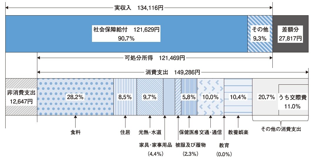 その一方で、年金などの社会保障給付、その他の収入を合わせた実収入は13万4116円となっています。「実収入」と、「消費支出」および「非消費支出」の合計との差額2万7817円が不足分となっています。