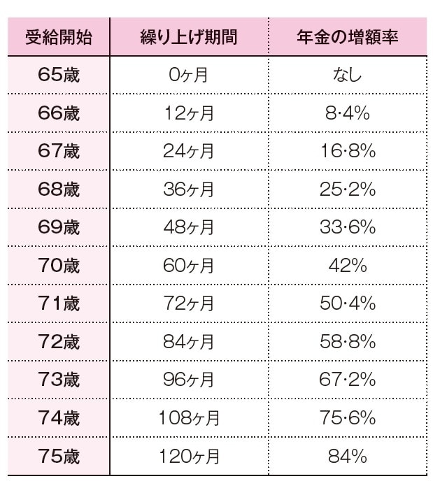 66歳から75歳までの間にもらい始めることを「繰り下げ受給」といいます。66歳以降、繰り下げ受給をすると、1ヶ月当たり0.7%、1年で8.4%、年金が増額されます。最長75歳まで10年間繰り下げると、84%増額され、一生続きます。