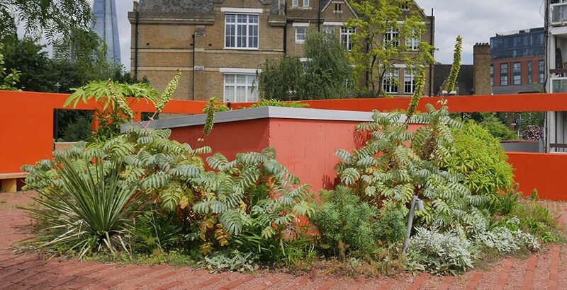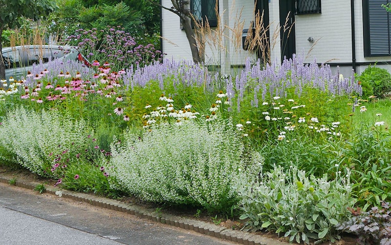 雨や風で植物が倒れていると、見る人に残念な印象を与えてしまうため、倒れにくく生命力の強い植物を選び、植え付け時からしっかり根を張れるよう土づくりにも工夫を重ねました。夏の厳しい暑さの中でもサバイヴする植物のエネルギーと、個性的な葉の形と色鮮やかな花々が作る景色を楽しんでいただけたら嬉しいです。