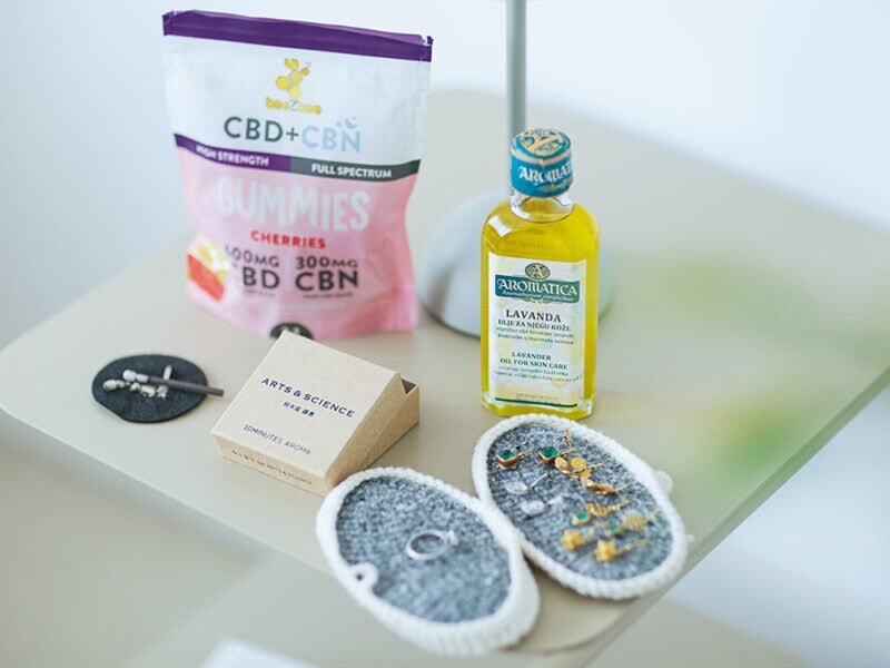 シーンに合わせてピアスをいくつか。ニットでつくられたケースに引っかけて。ハンガリーの国民的オイル、ラベンダーの香りがとても優しい。