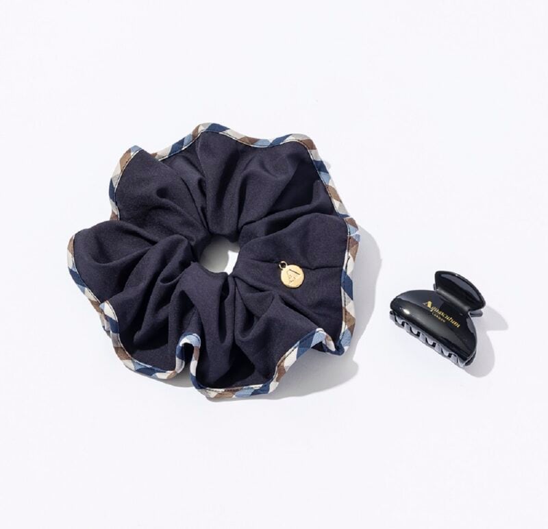 GLOW3月号増刊付録は、【アクアスキュータム】のビッグシュシュ&ヘアクリップ! ブランド&GLOW付録初!品格ヘアアクセサリーの2点セット!黒にゴールドのブランドロゴをあしらったヘアクリップと、ボリューム感たっぷりのシュシュはいつものヘアスタイルに華やかさとトレンド感を与えてくれます。