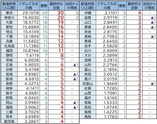 すなわち、アダムズ方式によれば小数点以下の端数は「切り上げ」となる。事実上、端数はほぼ生じ得ないため、結局、すべての都道府県に定数が『+1』ずつ配分されることになる(【図表】参照)。