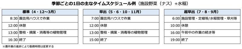 ●勤務時間等 受入れ農家等と協議の上、決定します。(想定年間活動日数:概ね252日) ※自然環境や季節、農作業の工程状況などにより日時は変わります。