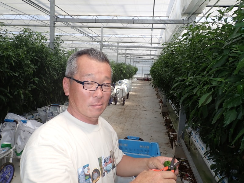 ・ピーマン生産農家:公文 基嗣さん(合同会社公文)※写真左 農業研修生の受入れ実績のほか、志のある雇用者に学ぶ機会を多く与えるなど、担い手育成にも力を入れている、高度な技術を駆使して生産面積を拡大する先進的な法人農家。