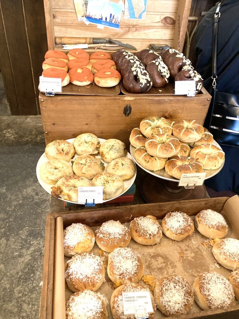 いきなり目に飛び込んでくる、綺麗にディスプレイされた色とりどりのベーグルに気分が更に高揚します。こちらは正面の棚で、チ-ズ、ガーリック、明太子などの食事系ベーグルです。