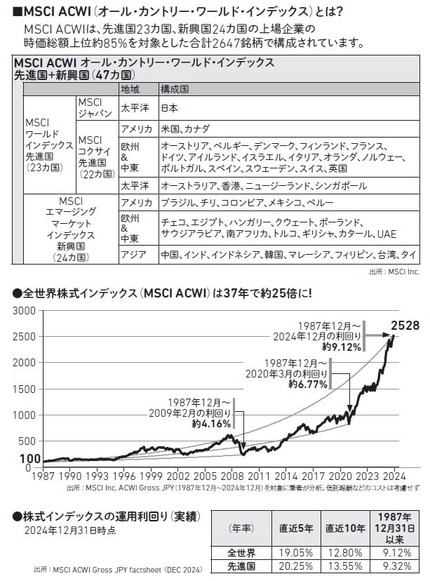 なお、本書では便宜上「オルカン」と述べている箇所がありますが、「MSCI ACWI」のインデックス(指数)に連動するファンドを指しています。