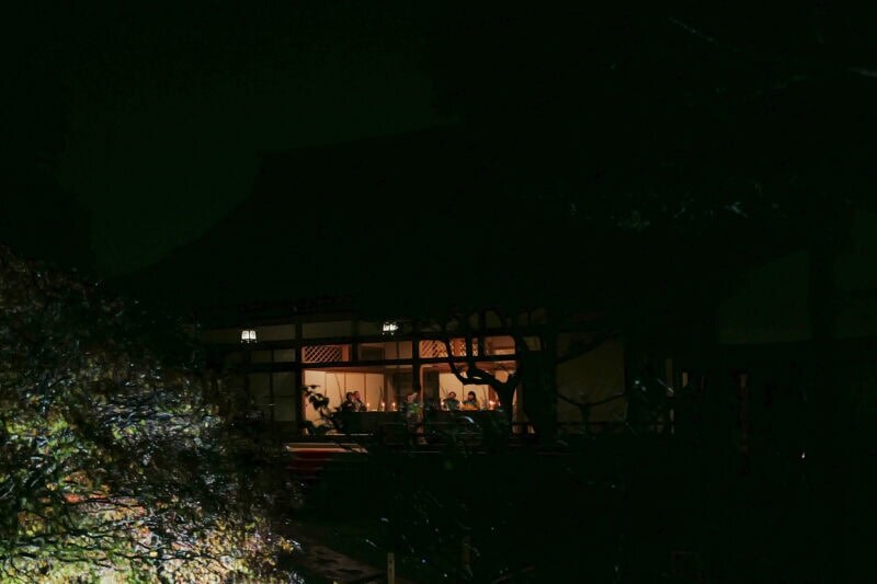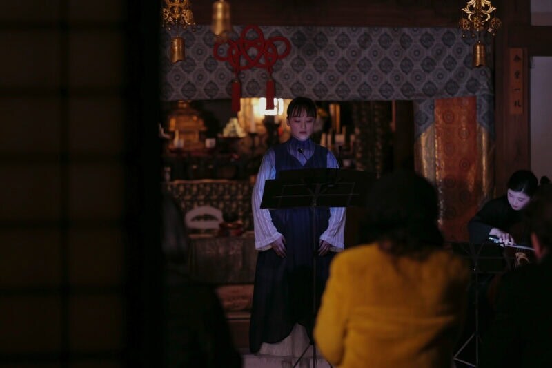 本堂に移動して畳の上に座ると、空気がふるえるようなチェロの音色とお能の謡が始まりました。その迫力たるや、心にずしんと響いたかと思えば、異界を彷徨うような不思議な浮遊感に包まれました。遡ること691年前にこの地に開かれた名刹報国寺。その本堂ゆえに、目には見えないものたちと共鳴するようにも感じます。14名のゲストのためだけに奏でられる音楽、能声楽の贅沢さといったら、生涯忘れられぬ体験になることでしょう。