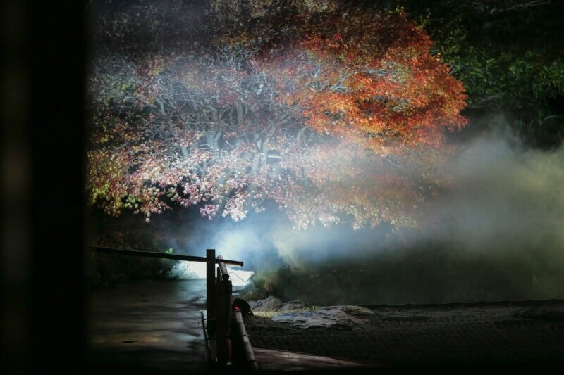 夜が更けるとライトアップされた庭には、冬の霧が立ち込める。