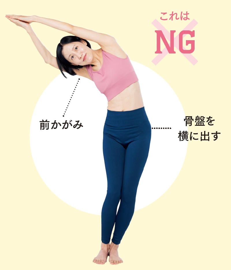 膝を曲げ、前かがみになると体側がしっかり伸びないので要注意。