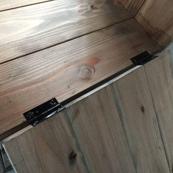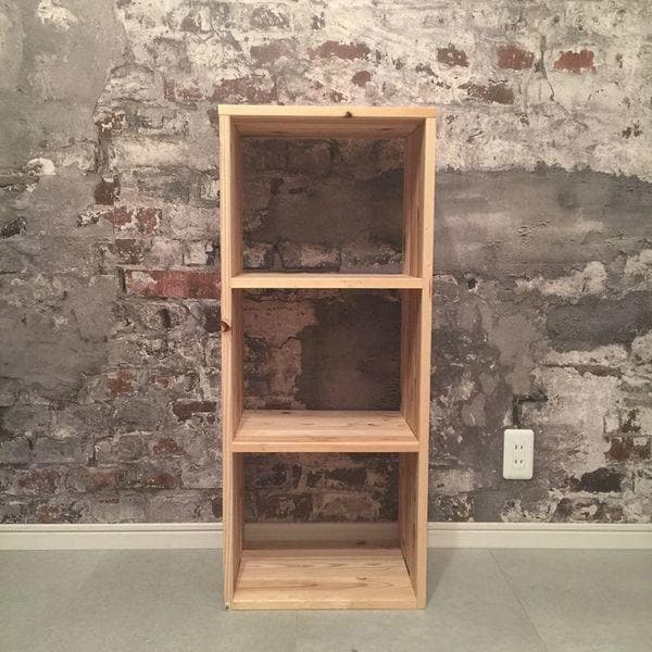 棚板を30cm間隔で、側板からビスで留めます。天板をのせて、上から側板に向かってビス留めします。その後、ステイン塗料で着色します。