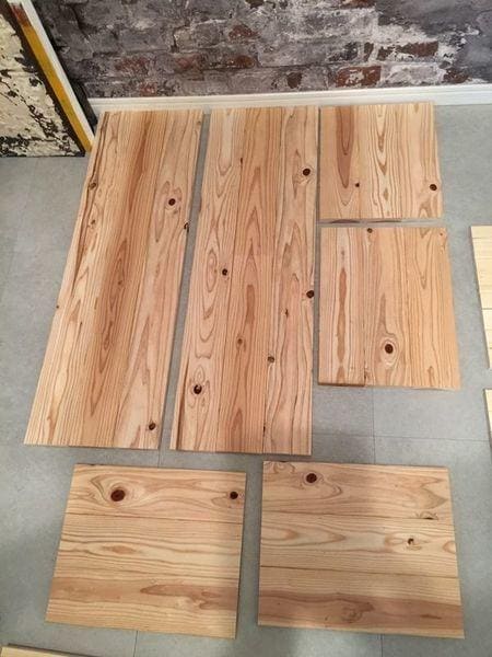 2) 木工ボンドで板をつなぎ合わせて、天板、側板、棚板を作ります。