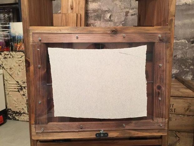 1段目の扉の枠をボンドで接着して、表裏ともタッカーでつなぎ目を留めて塗装します。