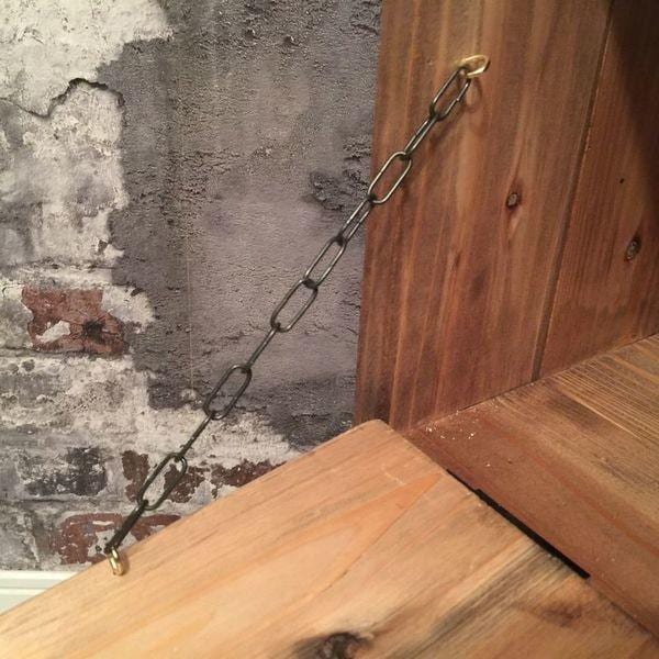 10) すべての扉に、直角に開いた状態で、棚部分は下から15cm、扉部分は下から11cmの部分にフックネジを取り付けてチェーンを掛けます。
