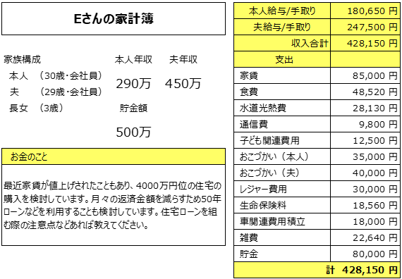 共働き、子供一人のEさんの家計簿は・・・?