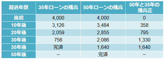 35年ローンを組んだ人が完済するタイミングで、50年ローンの人はまだ 1640万円の借金が残っています。この金額は当初借り入れた4000万円の約40パーセントの元本がまだ残っているということです。