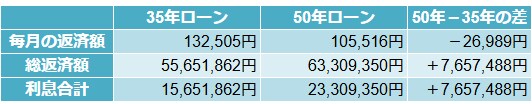 30歳で4000万円を借り入れ、金利2%、元利均等、ボーナス払いなしという条件で、35年と50年ローンを組んだときのローンを比較してみます。