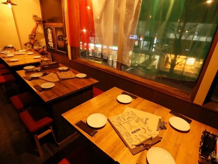 店内は、白い壁に赤いソファーがアクセント。壁に飾られた装飾品やシャンデリアのような照明などが、どことなく異国情緒を感じさせます。2人用のテーブル席をはじめ、少人数から大人数まで利用できるようさまざまな席が用意されており、いろいろなシーンで大活躍。