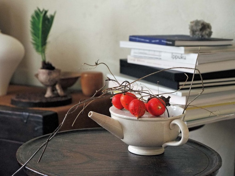 食器を活用することも多く、実ものを入れた器は、アンティークの薬のみ器。簡単に取り合わせただけだが、陶器の白に実の朱色が映えて、季節感を息づかせている。