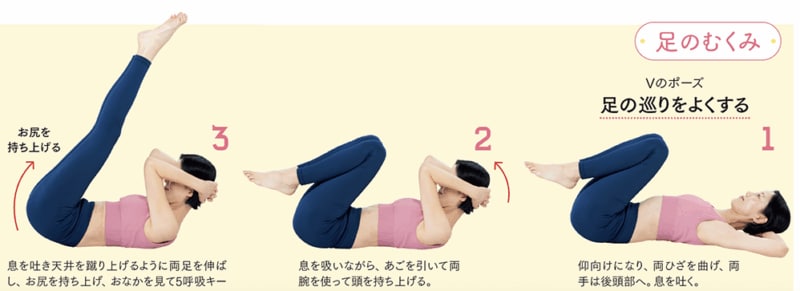 両足を持ち上げることで、滞っている下半身の血流が一気によくなり、むくみ解消に。体幹やおなかにもしっかり効かせるので、ぽっこりした下腹部が気になるときにも。