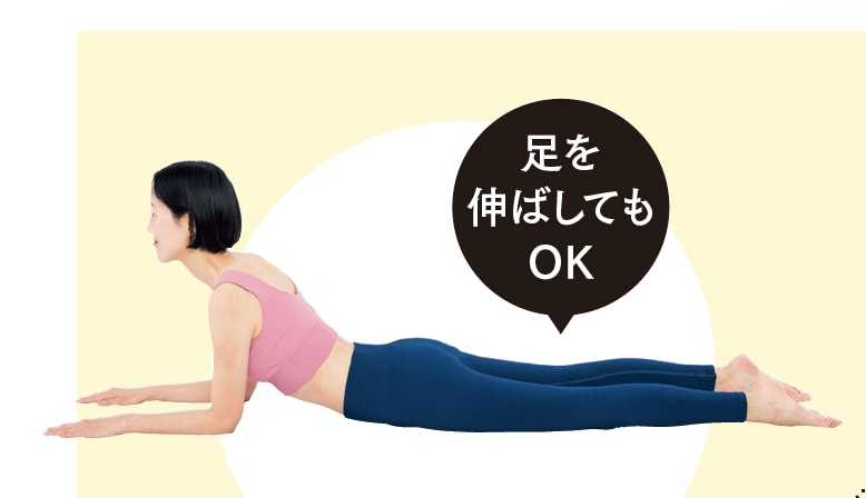 1. うつ伏せの姿勢から両足を開き、両足の裏を合わせる。手のひらは下に向け、顔の横に置き、息を吐く。