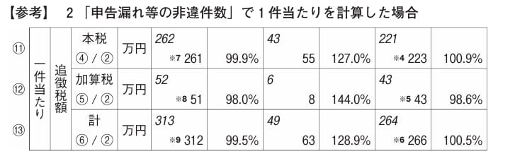 この数値は、④から⑥の数値を、調査等件数①で割ったものとなっていますので、調査等件数1件当たりの数値となります。この場合、非違が発見されなかった(申告是認となった)件数も分母の①の数値に入っています。
