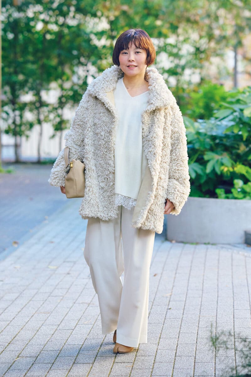 ボリューミーなファーコートに、しなやかなニットとレースのキャミソールをレイヤード。「パンツは光沢感のあるアイテムを選びました」。
